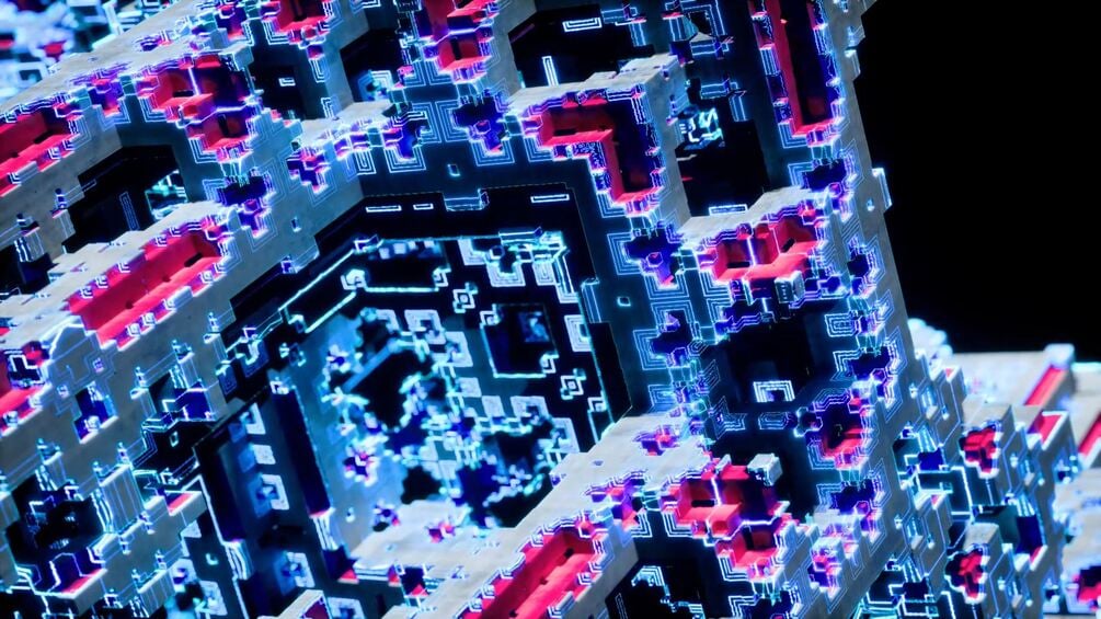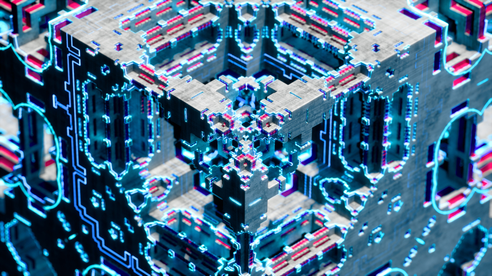 Techy morphing fractal scenes created with Unreal Engine 5. Four different cameras rendered at different locations within a Mixpinski fractal cube, with intricate neon patterns moving through the cube. Each clip features shifting parameters which animate to form a perfect loop. Loops are 1 minute in length.